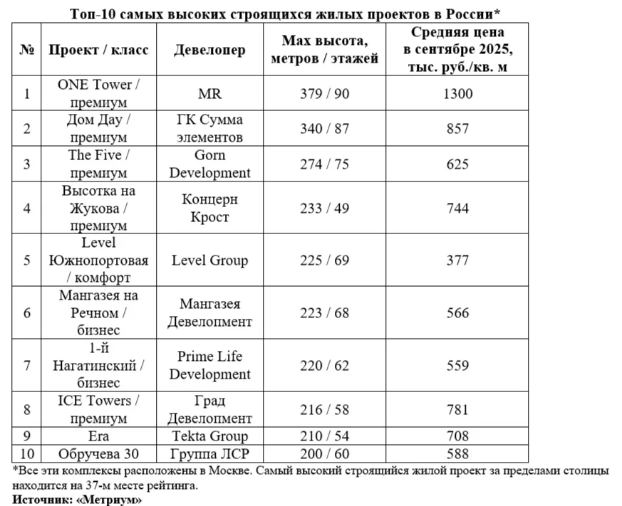 Средняя высота российских жилых новостроек в 2025 году превысила 19 этажей. Максимальный показатель зафиксирован в Москве – в среднем 31 этаж. Именно в столице сосредоточены практически все самые высокие жилые комплексы страны. Эксперты «Метриум» рассказывают о десяти высочайших строящихся девелоперских проектах в России.