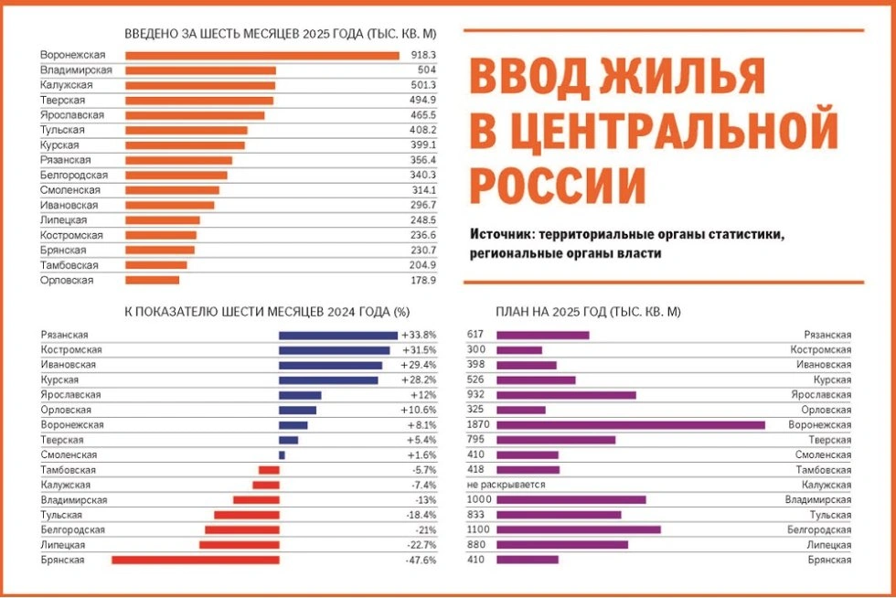 Несмотря на сложную экономическую ситуацию, в большинстве регионов Центральной России объем ввода жилья по итогам первого полугодия в сравнении с январем - июнем 2024 года вырос или снизился незначительно.